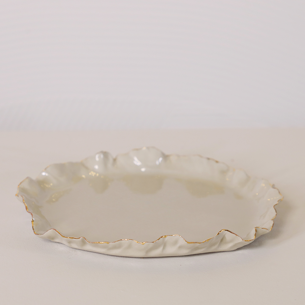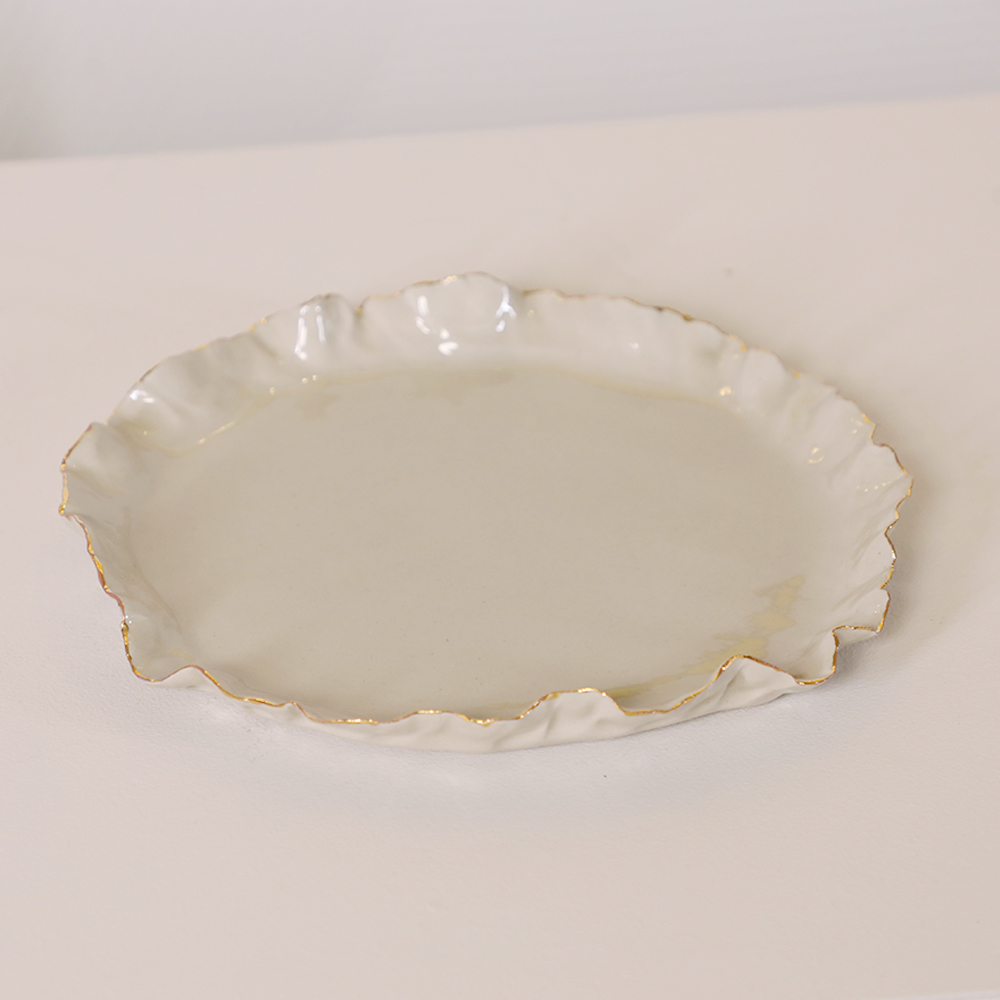 DESERT CERAMIC PLATE WITH GOLD RIM DIAMETER 20 CM DISHWASHER NOT SAFE INTRODUCING A REFINED LINE OF CERAMICS BY LA PLACE, WHERE CONTEMPORARY ELEGANCE MEETS TIME-HONORED CRAFTMANSHIP. THOUGHTFULLY DESIGNED AND EXQUISITELY HANDCRAFTED BY OUR GIFTED CERAMISTS, EACH PIECE EMBODIES A HARMONIOUS BALANCE OF FORM, TEXTURE AND FUNCTION. SCULPTED FROM THE FINEST CLAY AND FINISHED WITH NUANCED, TACTILE GLAZES, OUR CERAMICS CELEBRATE SUBTLE IMPERFECTIONS THAT MAKE EVERY OBJECT UNIQUE.