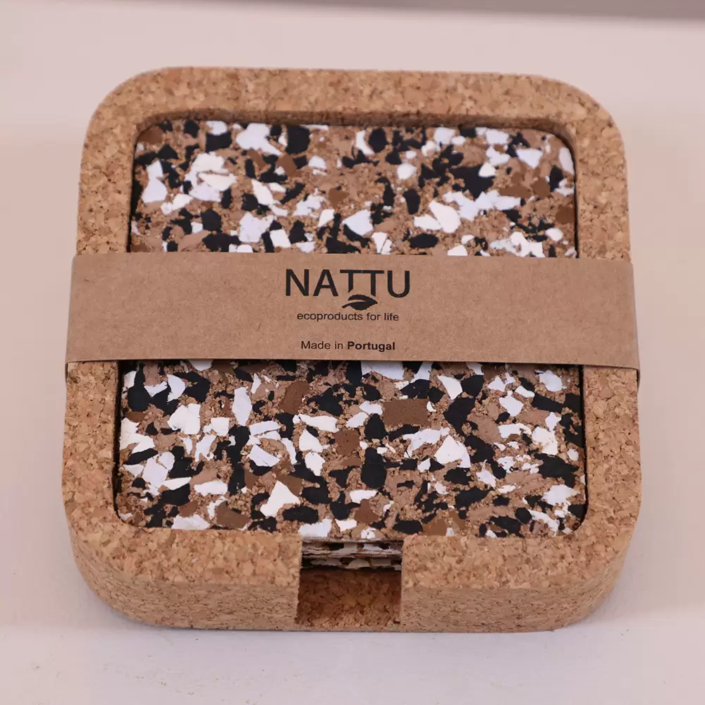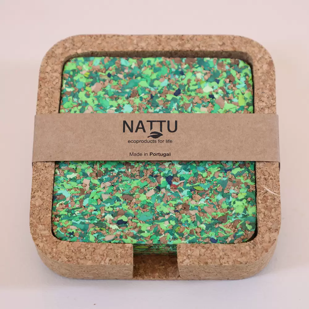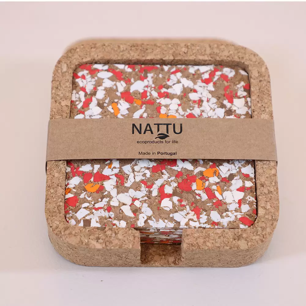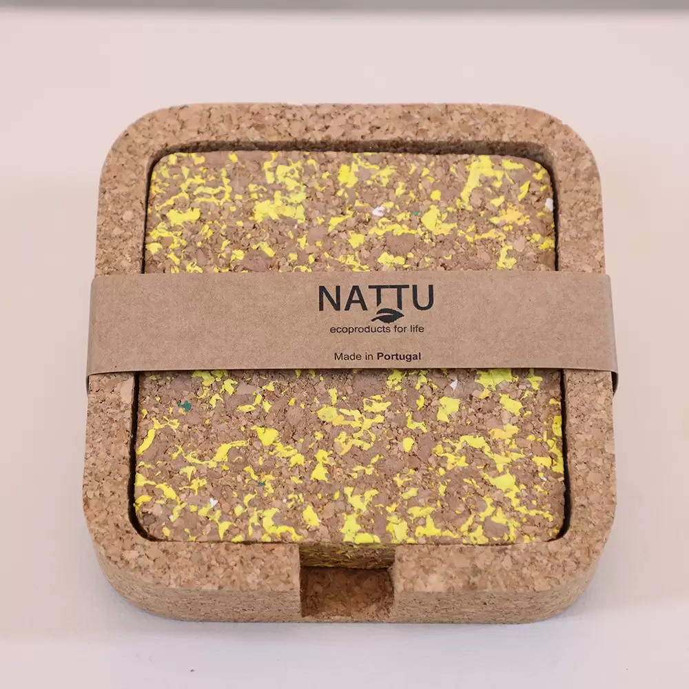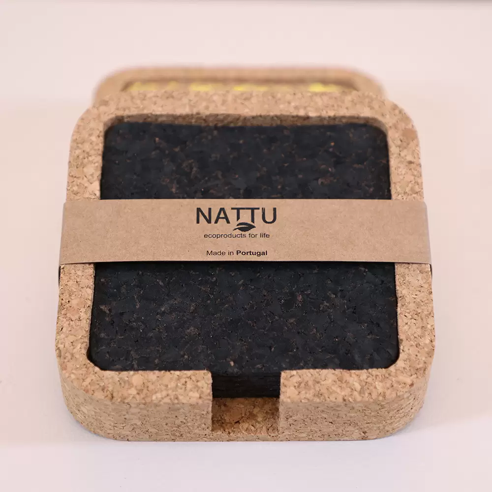 DEVELOP AND PRODUCE CORK PRODUCTS FOR DAILY LIFE. PROTECT THE PLANET. 100% NATURAL, RECYCLABLE, ECOLOGICAL, CO2 CAPTURE, NO TREES CHOPPED DOWN. SET OF 6 UNITS, IN A CORK GIFT BOX YELLOW, GREEN, BLACK AND WHITE, BLACK, RED. SIZE: 10 X 10 CM