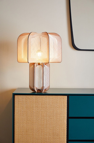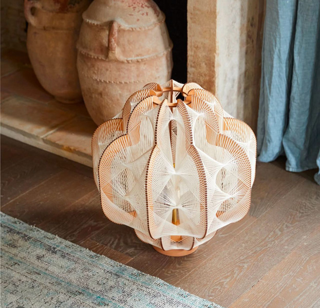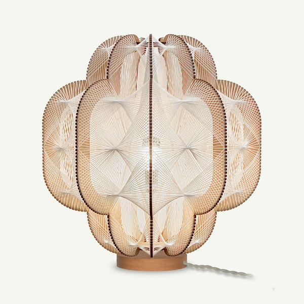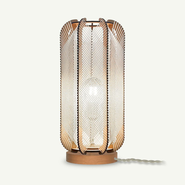 THIS OCCYGONE TABLE LAMP IS BOTH A SOURCE OF LIGHT AND A STRONG DECORATIVE PIECE. THE LAMPSHADE IS HAND-WOVEN ON A BASE OF GEOMETRIC WOODEN ARCHES WITH REFINED CURVES. THE TWIST PATTERN OF STRETCHED RIBBON LETS THE LIGHT FILTER AND SCULPT. WOODEN STRUCTURE – NATURAL WHITE COTTON RIBBON WEAVE, NATURAL BEECH BASE HEIGHT: 53 CM DIAMETER: 50 CM
