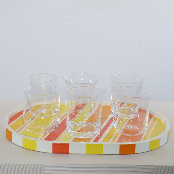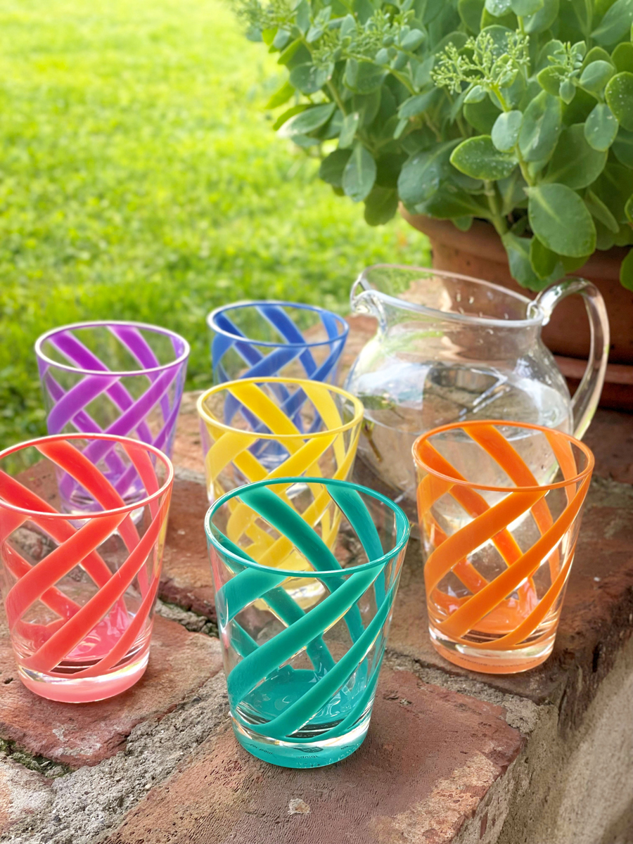 SET OF 6 COMPOSITION: METHACRYLATE D:9 H:11 Transparent glass with full cream spiral, made of TOP QUALITY methacrylate, a plastic material more transparent than glass, resistant to UV rays and 100% recyclable. Not compatible with sun creams. The material used gives these glasses lightness and practicality, resistant to impacts and suitable for food use. They are ideal for outdoor use for: picnics, barbecues, boat parties, birthdays, anniversaries, garden parties, outdoor lunches or dinners. Our collections are also highly appreciated for the modern and refined aesthetics that characterize them. Dishwasher safe using a neutral detergent, at a maximum temperature of 60 degrees, on the top shelf of the machine. Dry with a soft cloth after washing. Do not use abrasive sponges.