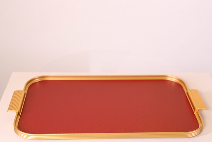 ANODISED ALUMINIUM TRAY WITH RIBBED EXTRUDED EDGE AND HANDLE SECTIONS, HAND FINISHED AND ASSEMBLED 460 X 300MM COLOR: DIAMOND MAGENTA/ GOLD
