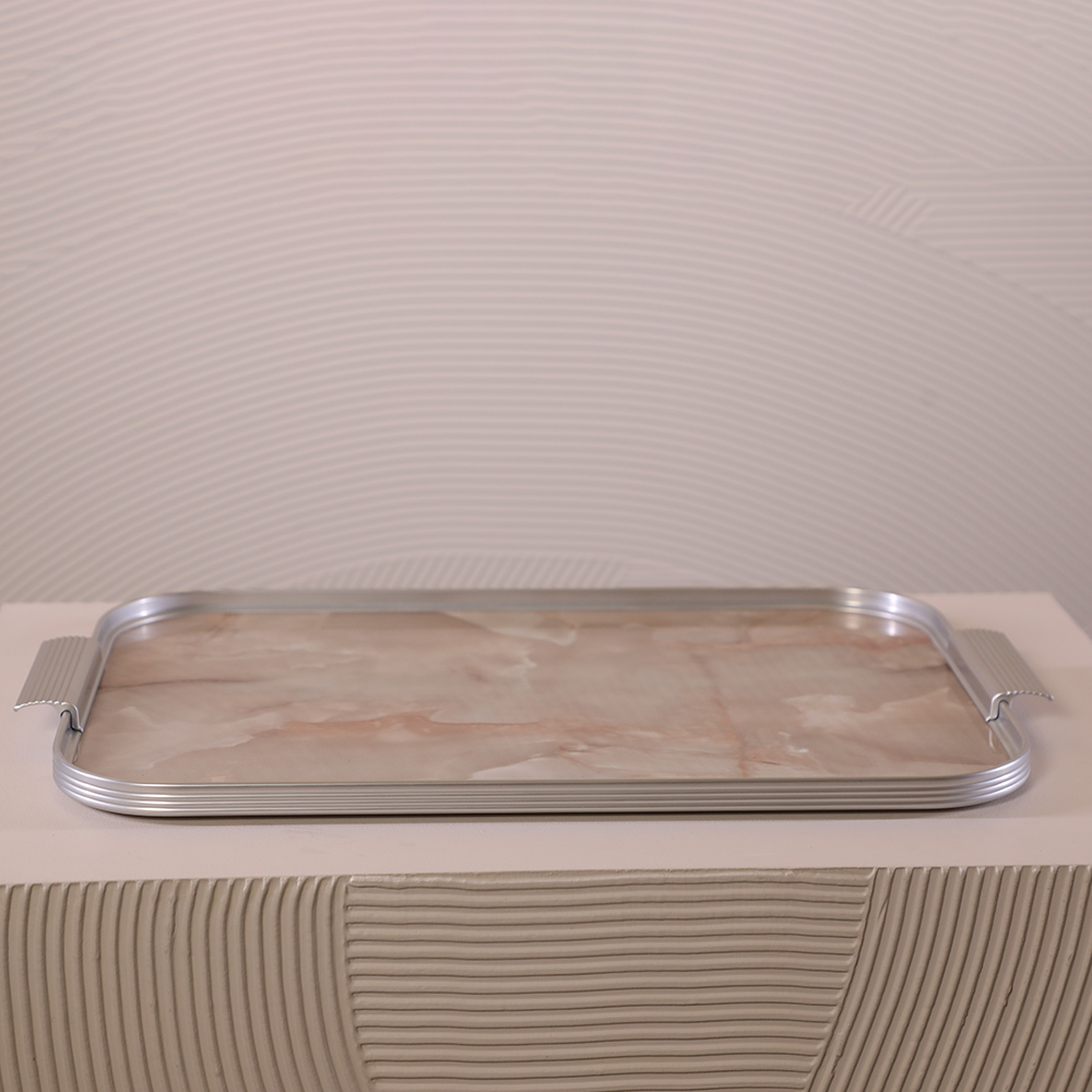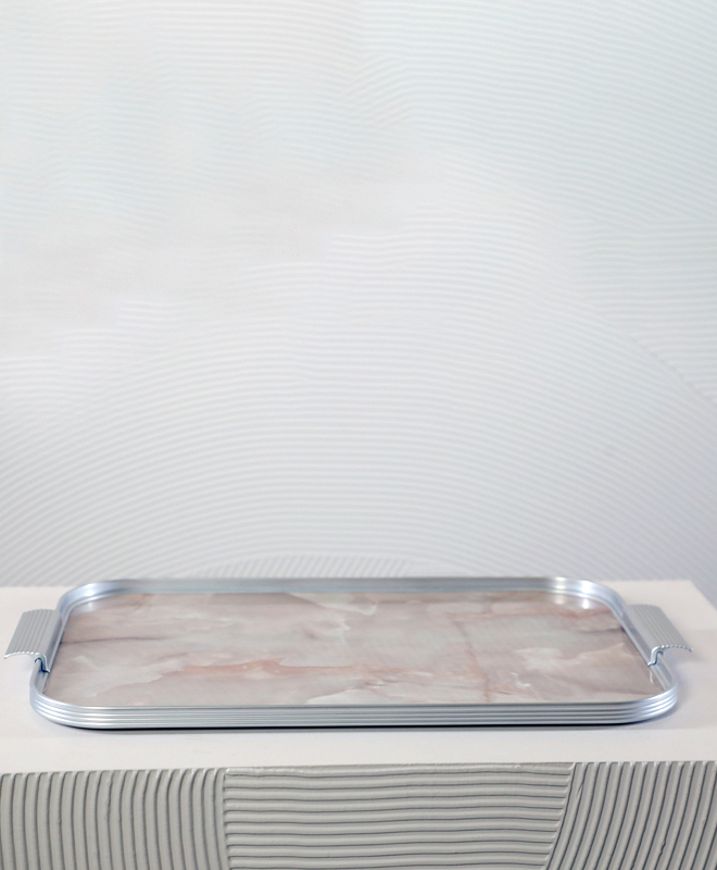 ANODISED ALUMINIUM TRAY WITH RIBBED EXTRUDED EDGE AND HANDLE SECTIONS, HAND FINISHED AND ASSEMBLED SIZE: 460 X 300MM COLOR: ONYX/ SILVER