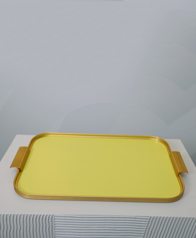 ANODISED ALUMINIUM TRAY WITH RIBBED EXTRUDED EDGE AND HANDLE SECTIONS, HAND FINISHED AND ASSEMBLED 460 X 300MM COLOR: ROSE PINK/ GOLD