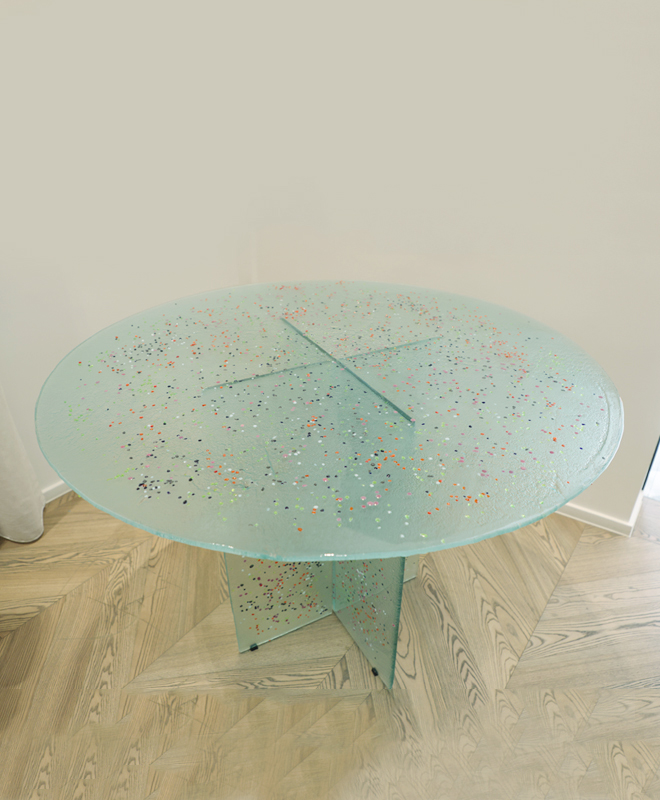 TABLE CONFETTI FUSED GLASS,DESIGNED AND HANDCRAFTED BY OUR LOCAL ARTISANS. DIAMETER: 110 CM