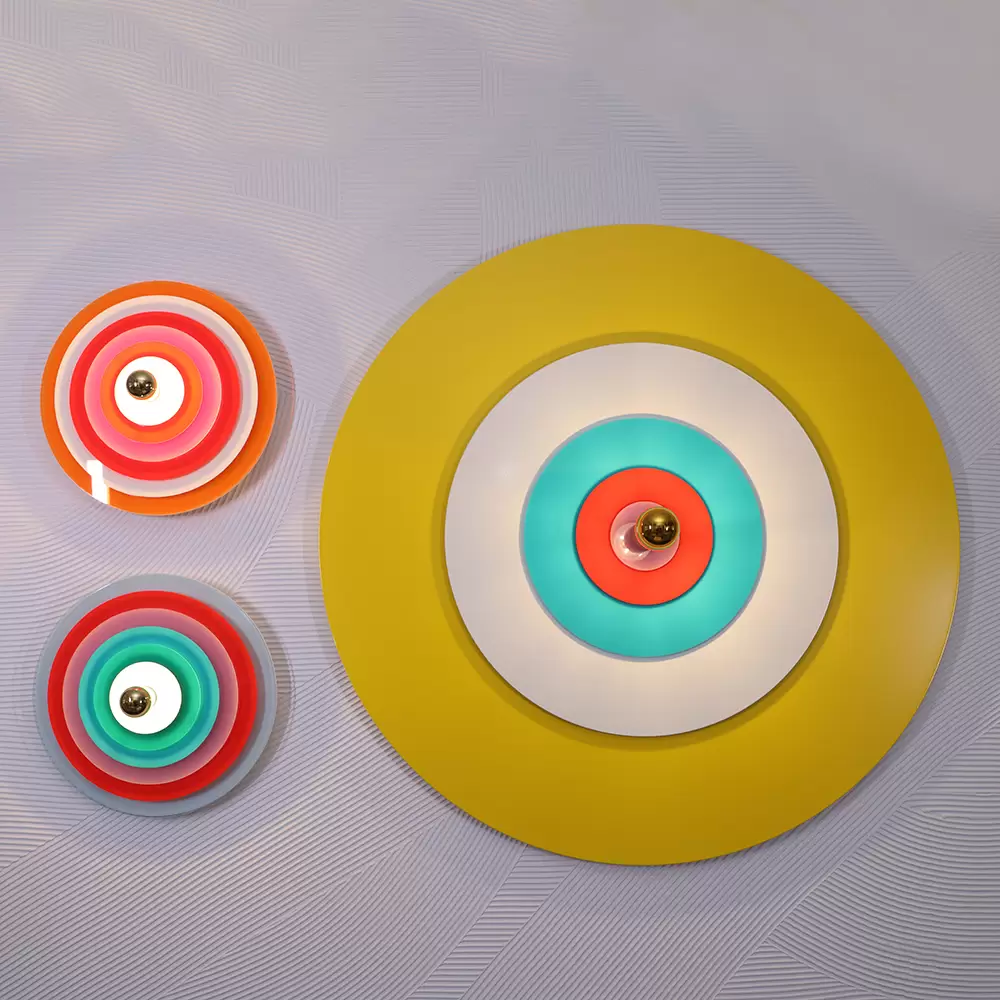 PLAYING WITH LUMINOUS FINISHES, THE LAMP OFFERS A SUBTLE VARIATION OF COLORS DEPENDING ON THE VIEWING ANGLE, THUS CREATING A PLAYFUL LUMINOUS OBJECT THAT COMBINES FUNCTIONALITY AND POETRY. THE GOLDEN BULB DELICATELY REFLECTS THE LIGHT ON THE WALL, HIGHLIGHTING THE PLAY OF COLORED SHAPES AND SUBTLE SHADOWS. THE INDIRECT LIGHT EMANATING FROM THE WHOLE IS SOFT, SOOTHING AND UPLIFTING, WITH BEAMS OF LIGHT DELICATELY ESCAPING THROUGH THE GAPS BETWEEN THE DISCS. WHETHER ON OR OFF, THE LAMP AROUSES AN INTENSE AND JOYFUL EMOTION. 5KG HEIGHT: 95CM WIDTH: 95CM DEPTH: 12CM POWER SUPPLY: 230 VAC MATERIAL: ACRYLIC GLASS + POWDER COATED ALUMINIUM